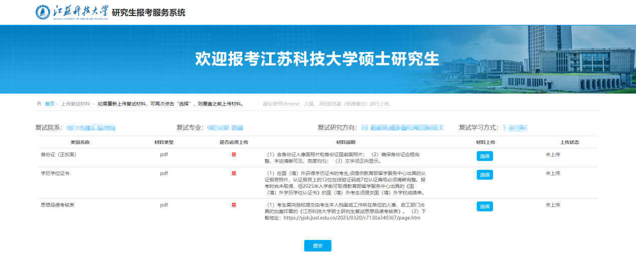登录系统后,点击“上传复试材料”。需按要求上传相关材料用于复试资格审查。